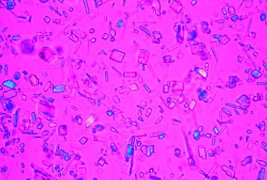 В синовиальной жидкости может быть идентифицировано большое количество разнообразных кристаллов. Однако диагностическую ценность представляют только два типа из них. Кристаллы урата натрия являются признаком подагры, а кристаллы дигидропирофосфата кальция обнаруживаются при псевдоподагре. Эти кристаллы могут быть выявлены при поляризационной микроскопии.