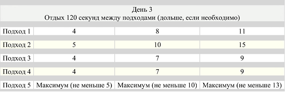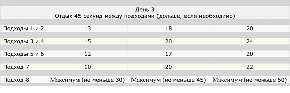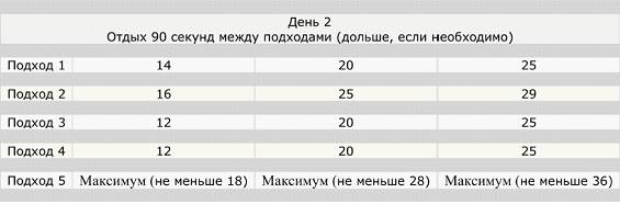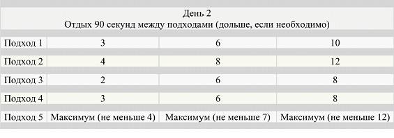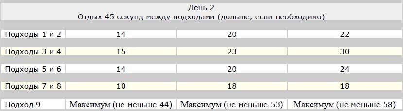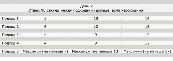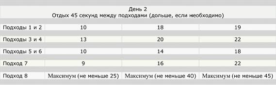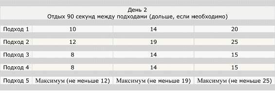 Суть такова: делая по 5 подходов каждый день, первый – 2 повторения, второй – 3, третий – 2,четвёртый – 2, пятый – 3 подхода, вы каждый день добавляете по нескольку повторений.