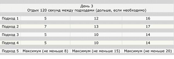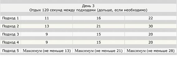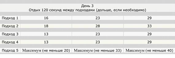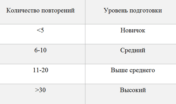 Вы определили свой уровень подготовки, теперь вперед! Исходя из результатов выбираем нужный столбец и выполняем указанное количество повторений. Тренироваться необходимо 3 раза в неделю