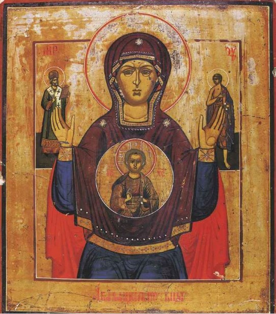 Для начала разберемся в иконографии образа. На иконе Божья Матерь изображена по пояс и с распростертыми руками, направленными к небу, а также Младенец, показывающий правой рукой благословляющий жест, а в левой он держит свиток. Также есть варианты, где Богоматерь изображается в рост.