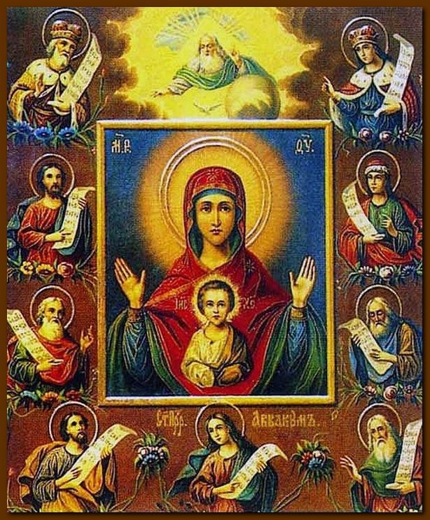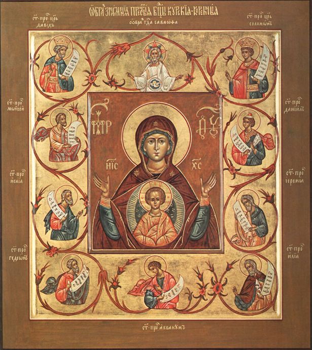 Лики пророков обращены к изображению Богородицы, имеющей в недрах Своих Эммануила. На правой стороне иконы изображен царь и пророк Соломон; в правой руке его свиток с изречением: «Премудрость созда себе дом,» а за ним книзу следует пророк Даниил; в левой руке у него свиток с изречением: «Аз видех гору каменную». За сим — пророк Иеремия со свитком в левой руке, на котором изречение: «Се, дние грядут, глаголет Господь». Внизу — пророк Илия со свитком в обеих руках, на котором изречение: «Ревнуя поревновах о Господе». На левой стороне вверху царь и пророк Давид со свитком в левой руке, на котором изречение: «Воскресни Господи в покой Твой». Ниже — пророк Моисей со свитком в обеих руках, на нем изречение: «Аз видех купину огни….». За ним — пророк Исаия со свитком в правой руке с изречением: «Се дева во чреве приимет». За сим — пророк Гедеон со свитком в левой руке, на котором изречение: «Сниде яко дождь на руно». На нижней части иконы изображен пророк Аввакум со свитком в обеих руках, содержащим изречение: «Бог от юга приидет».